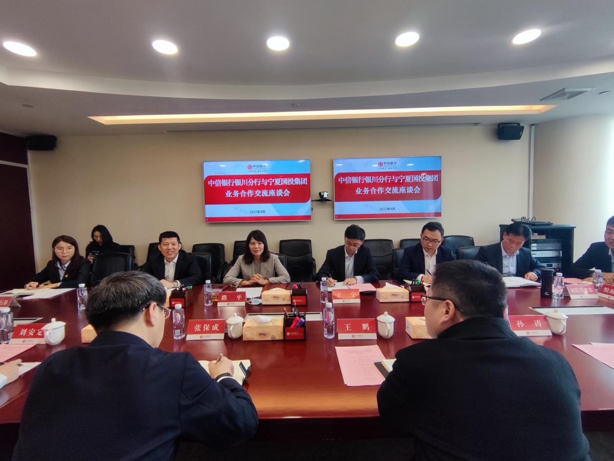 4月26日,宁夏国投集团与中信银行银川分行举行业务合作交流座谈会。集团公司党委副书记、总经理张保成带队参加。