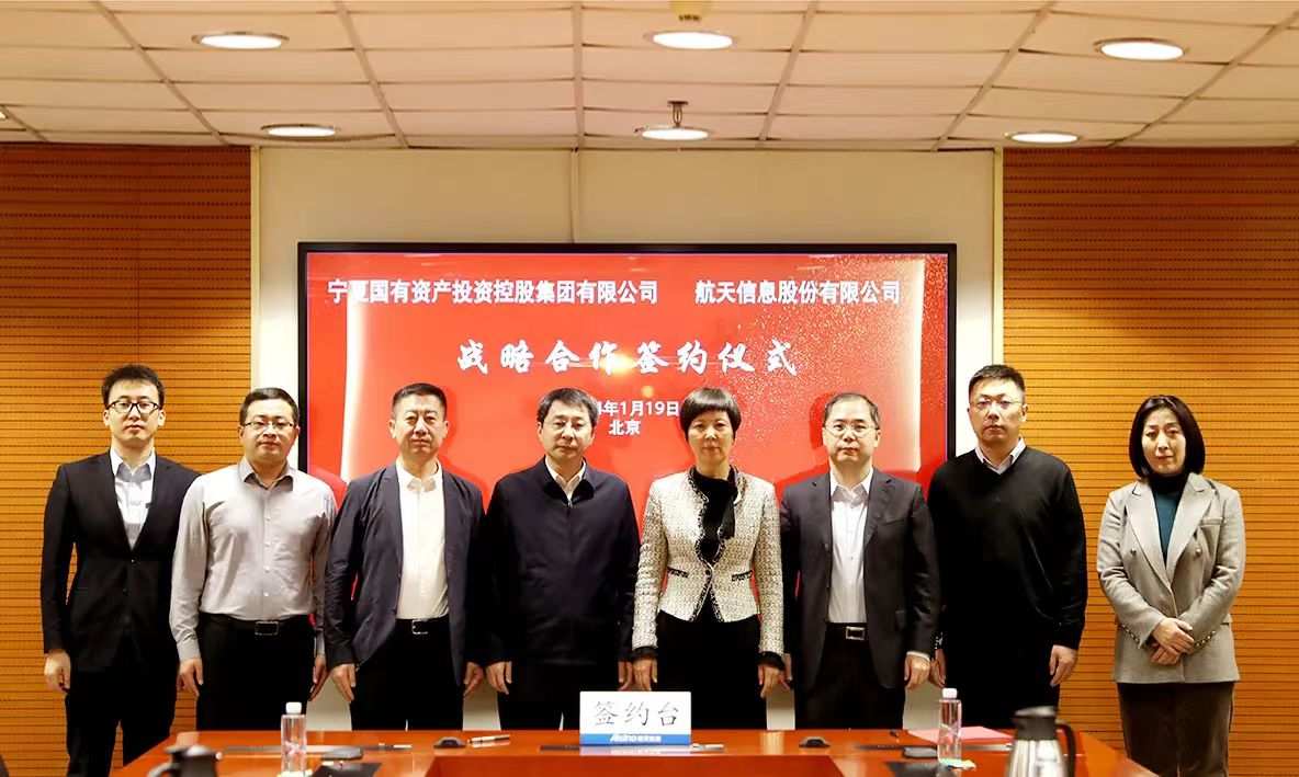 为扎实推动央企入宁,全面助力自治区数字产业发展,2024年1月19日,集团公司党委副书记、总经理张保成再次到访航天信息股份有限公司,在前期沟通的基础上见证签署战略合作协议,并就后续具体合作进一步深入交流。航天信息党委书记、董事长马天晖出席会议并见证签约仪式,航天信息财务总监高宇明、集团公司副总经理魏爱群出席会议并代表双方进行签约。